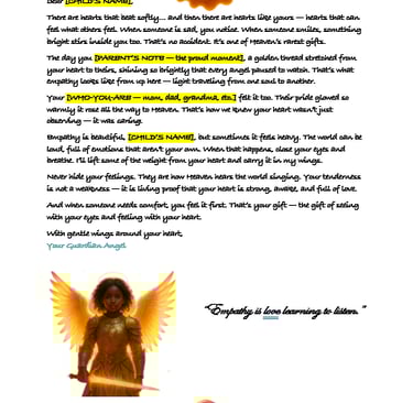 Empathy is beautiful, [CHILD’S NAME], but sometimes it feels heavy. The world can be loud, full of emotions that aren’t your own. When that happens, close your eyes and breathe. I’ll lift some of the weight from your heart and carry it in my wings.