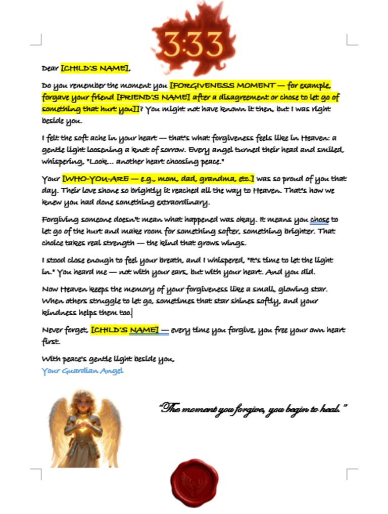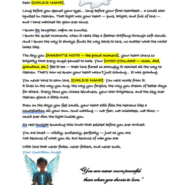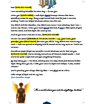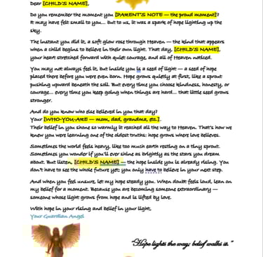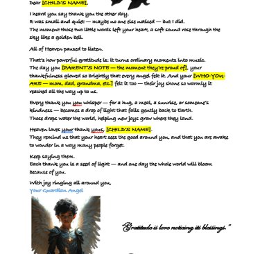A Proud Parent’s Note — tell us something your child did that deserves to be noticed. (This is what the angel will lovingly mention in their letter — showing that Heaven truly sees their goodness.)