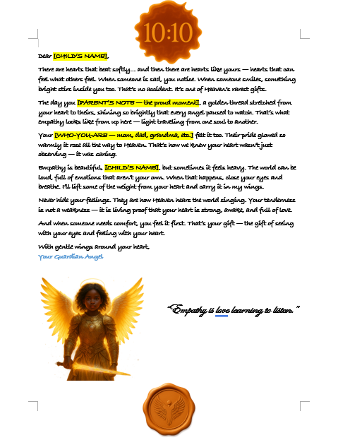 The day you [PARENT’S NOTE — the proud moment], a golden thread stretched from your heart to theirs, shining so brightly that every angel paused to watch. That’s what empathy looks like from up here — light traveling from one soul to another.
